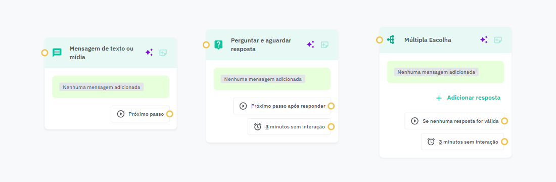 Mensagem de texto ou mídia, Perguntar e aguardar resposta e Múltipla escolha: A IA ajuda a otimizar o tom e conteúdo da mensagem, sugerindo variações mais empáticas e adequadas ao contexto.