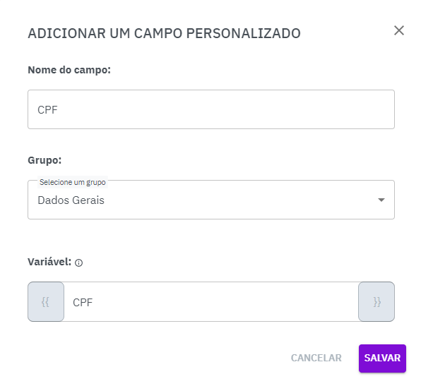 Essa ação, abrirá um popup para ser preenchido com as informações: nome do campo, grupo e a variável.
