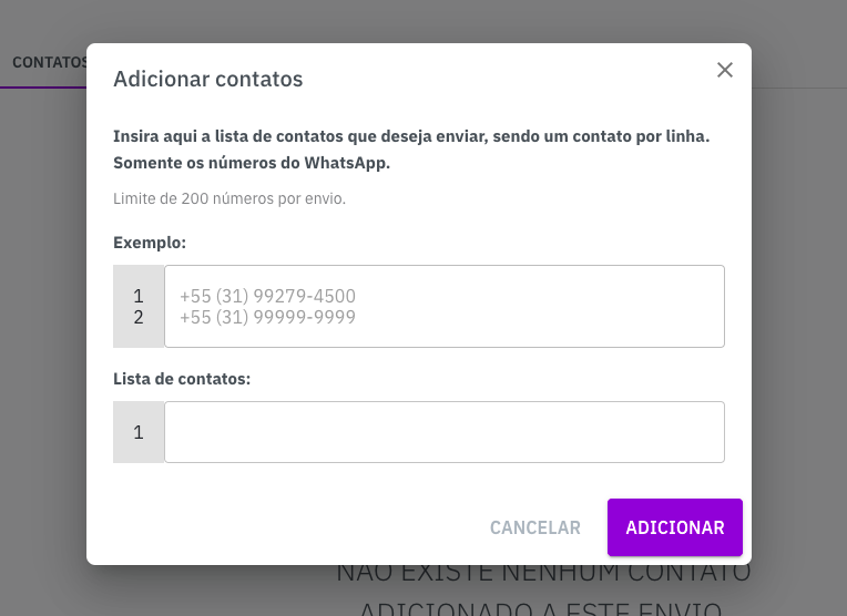 Aparecerá esta janela onde você poderá inserir a lista de contatos que deseja enviar, sendo aceitos somente os números do WhatsApp.