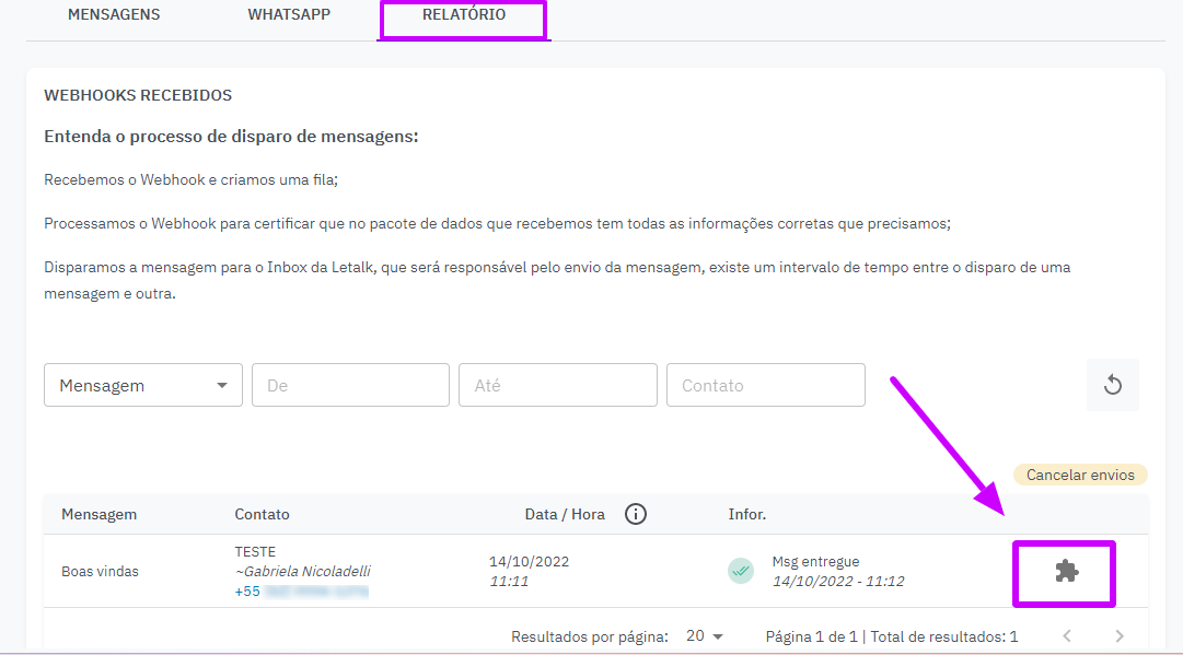 Para verificar as informações do webhook, entre no relatório da própria integração