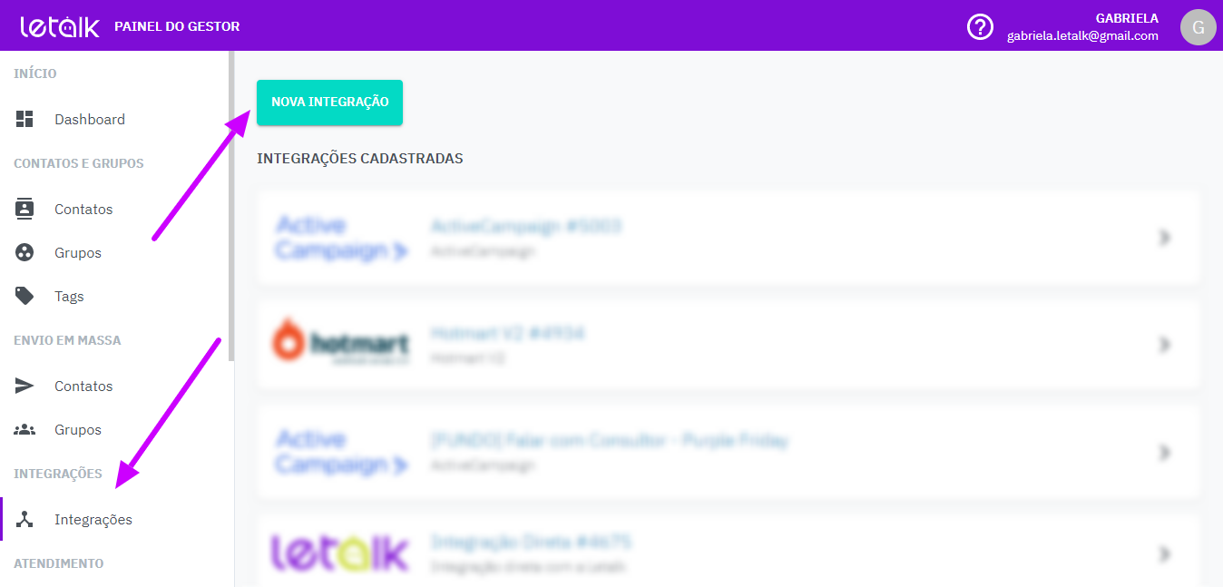 No Painel do Gestor, em “ Integrações “ clique em NOVA INTEGRAÇÃO