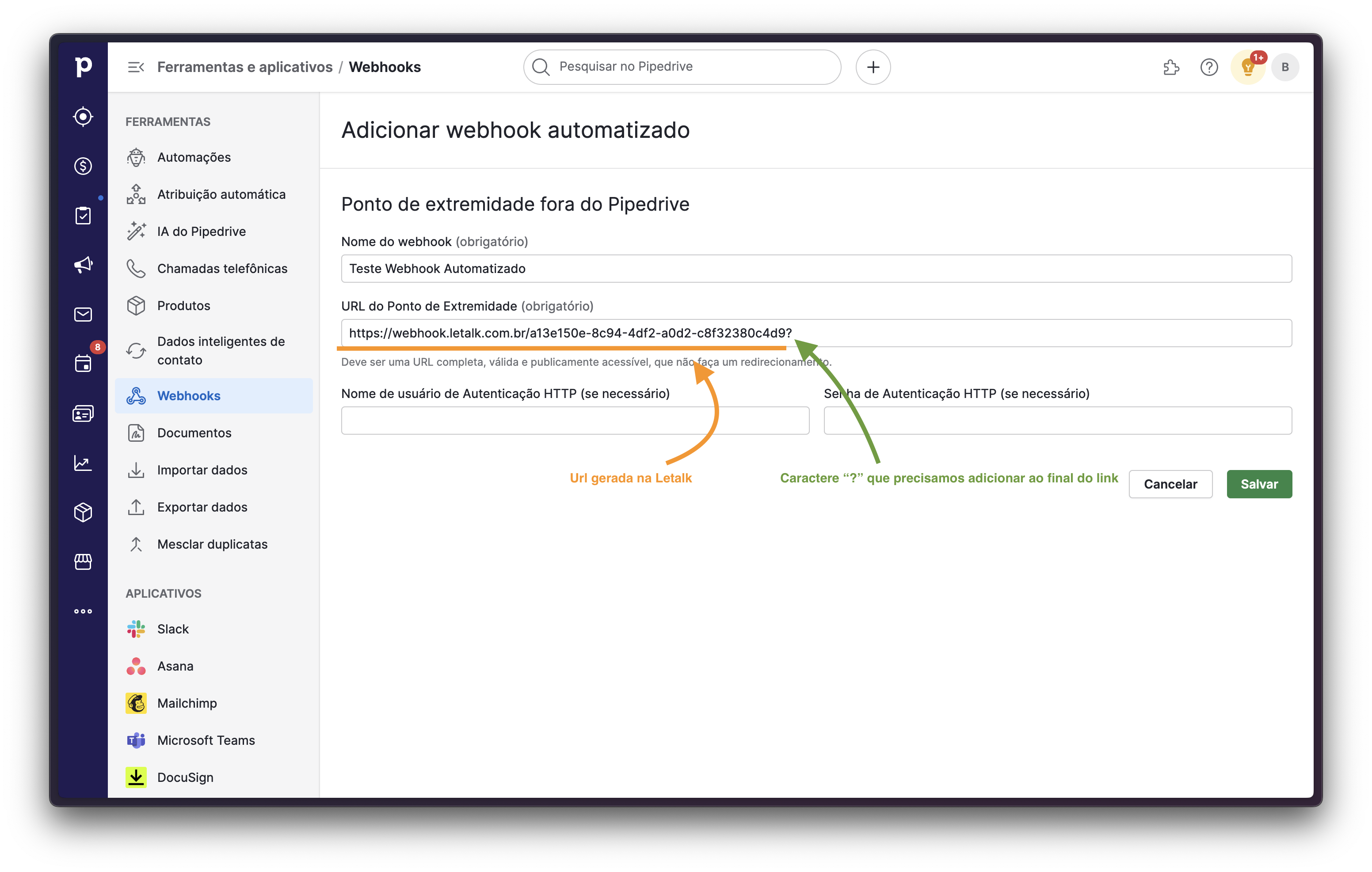 Após a inserção da url + "?" ao final dela, podemos clicar no botão em verde escrito "Salvar" e pronto, agora já temos o Webhook configurado corretamente. O próximo passo vai consistir em utilizarmos ele em nosso fluxo de automação no Pipedrive.