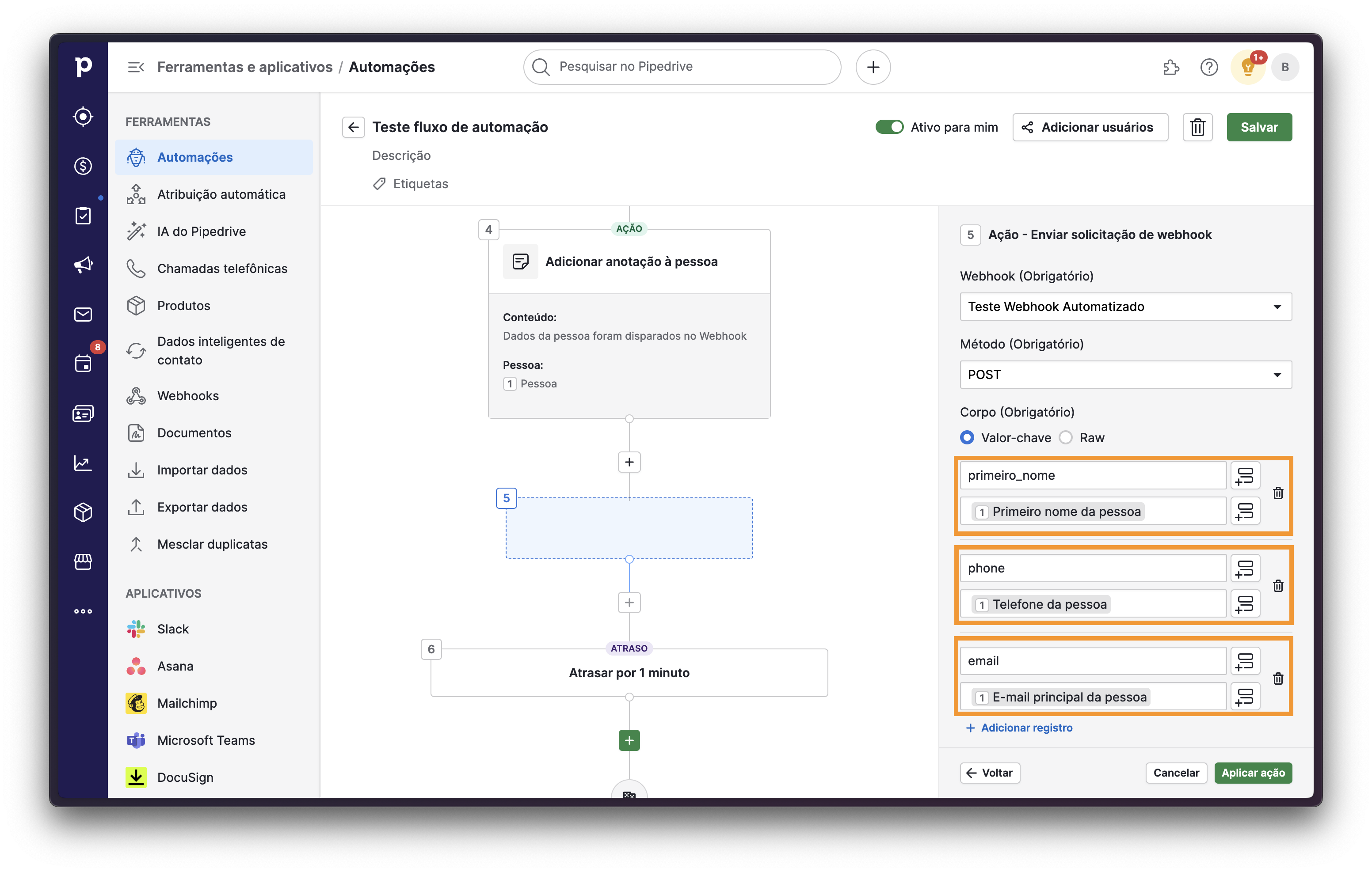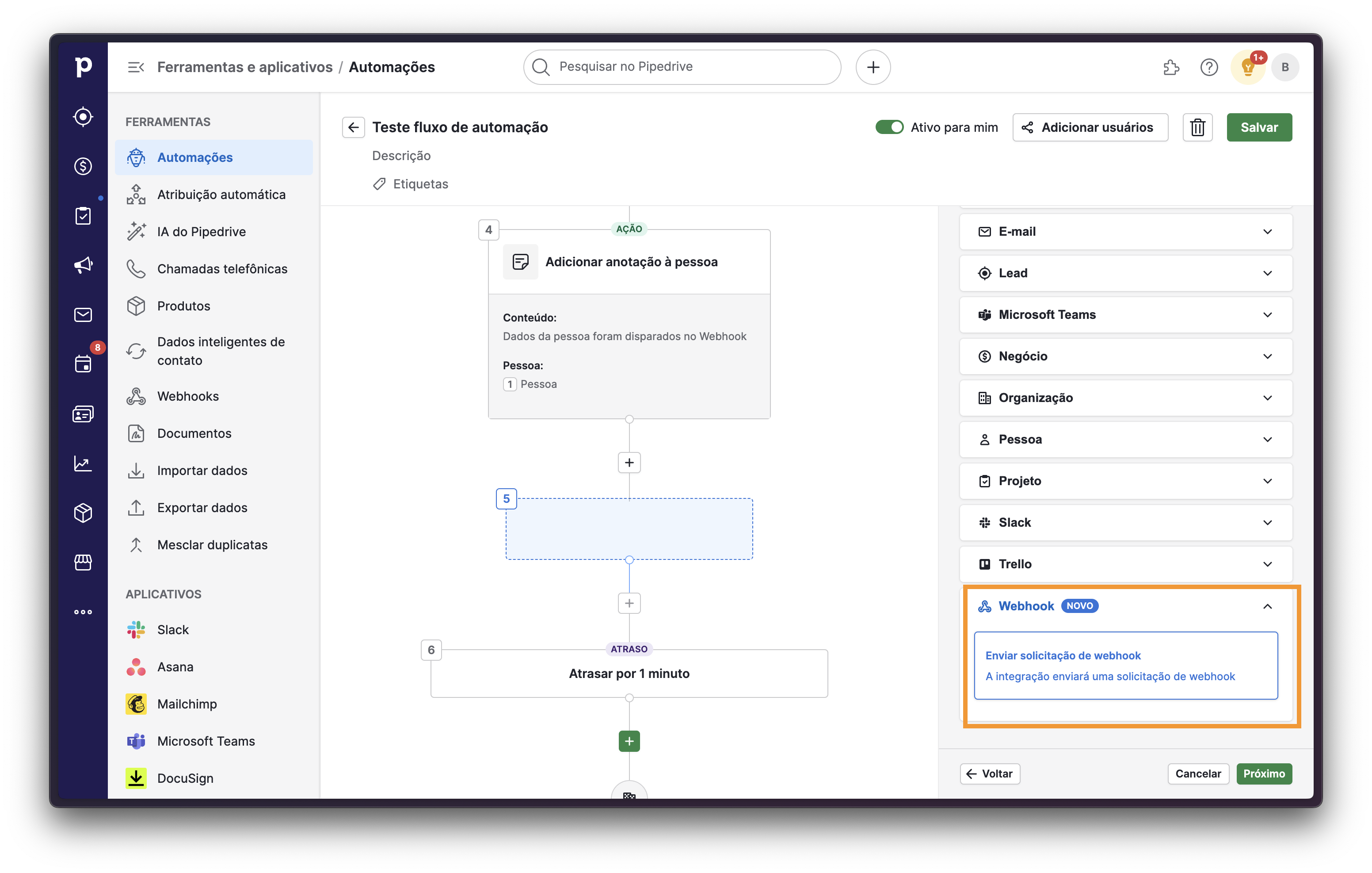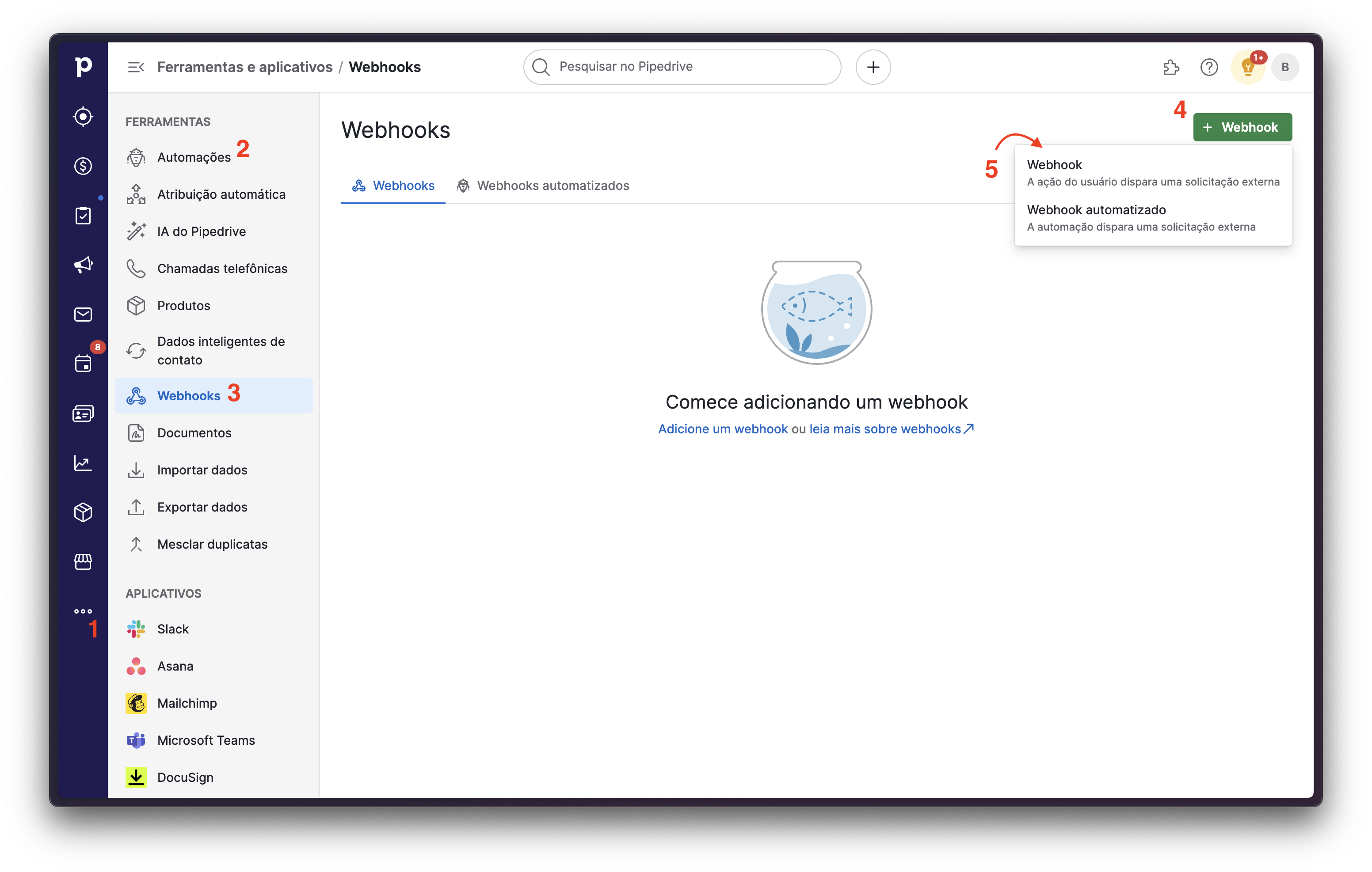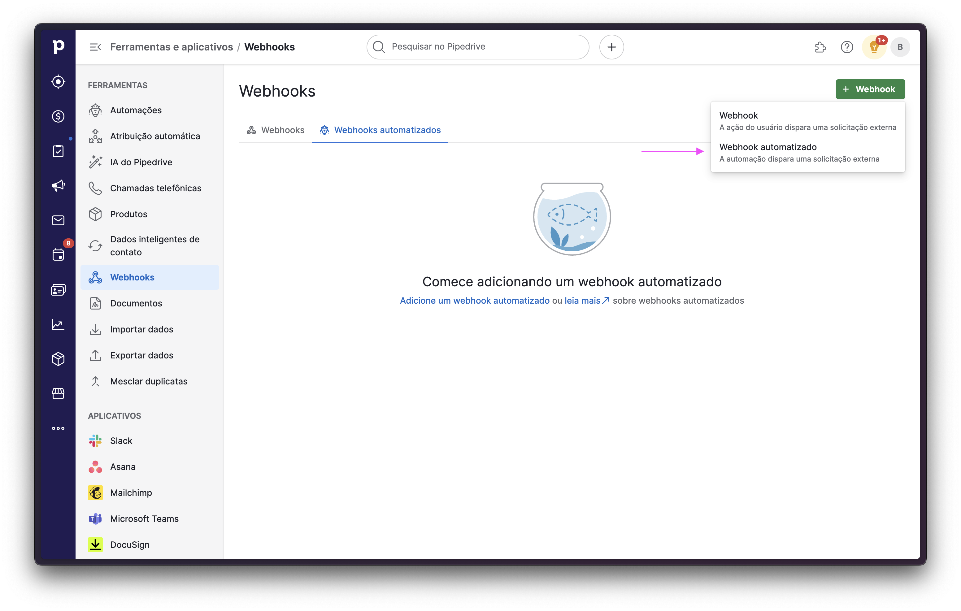 Diferente do Webhook convencional, o Webhook automatizado surgiu com a finalidade de permitir que sejam enviados Webhooks através de um fluxo de automação criado no Pipedrive.