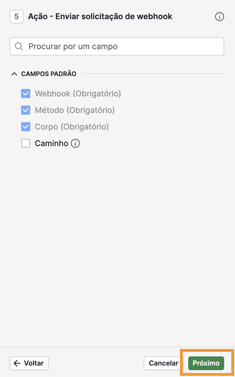 Para fazer isso, vamos precisar utilizar o bloco de Webhook que está localizado dentro de "Ação" -> Webhook selecionando-o e clicando em "próximo".