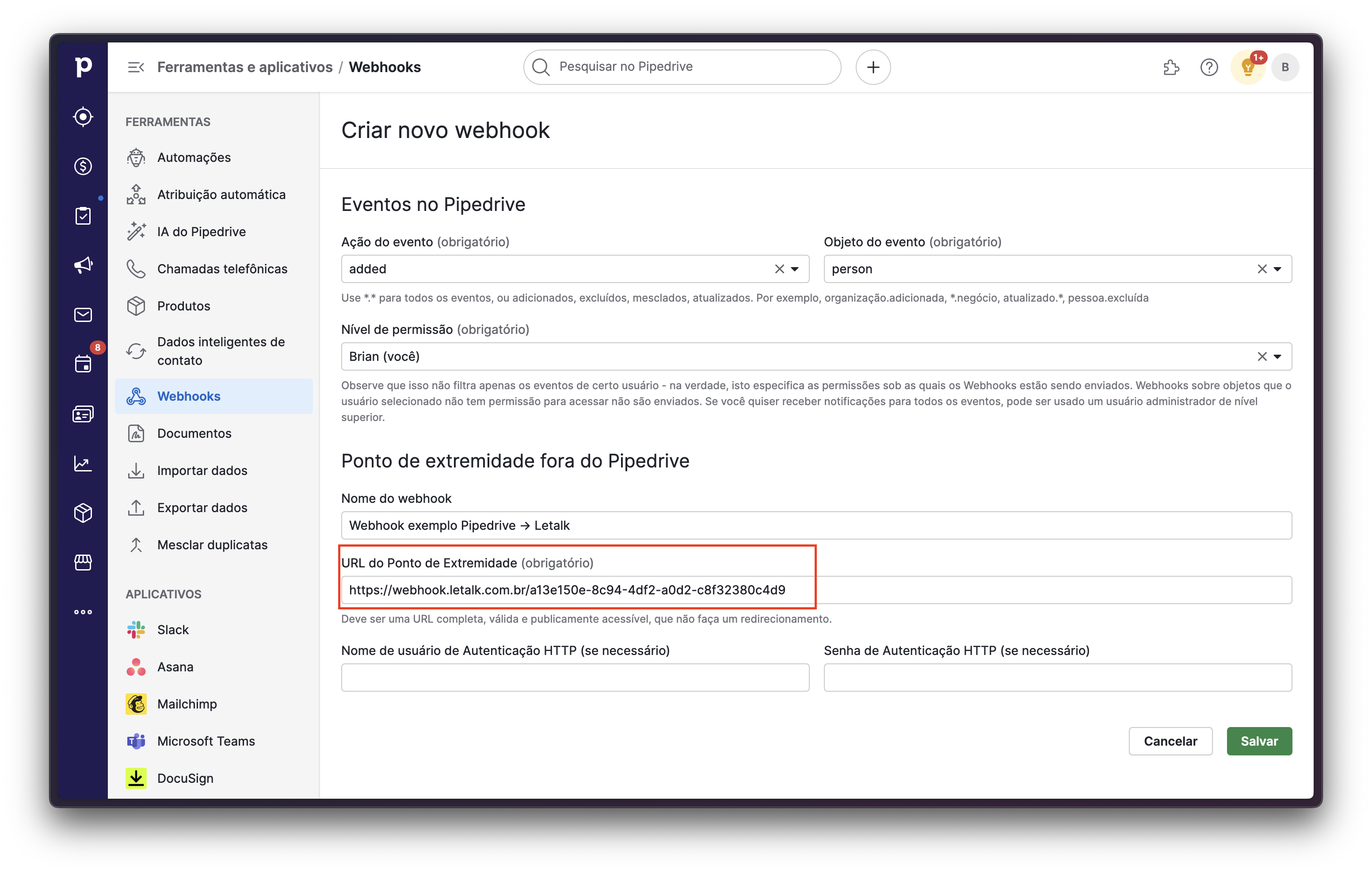 Após acessar a página de configuração de um novo Webhook, vamos escolher qual será o evento que irá ocorrer dentro da plataforma da Pipedrive para que o Webhook seja enviado para a Letalk, em seguida, defina um nome que deseja salvar para identificar o Webhook no Pipedrive e depois, cole o link do Webhook gerado em seu chatbot na Letalk e clique em "Salvar".