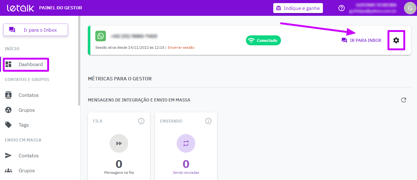 No Painel do gestor, em “Dashboard” clique no ícone de configurações