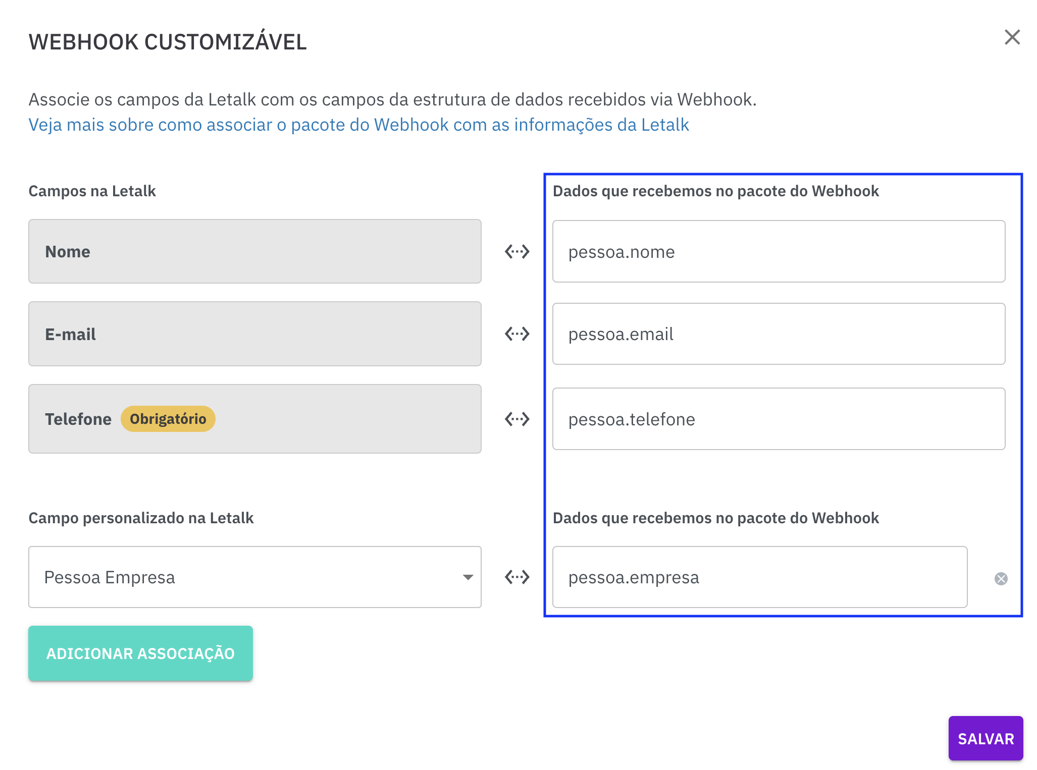 Em nosso exemplo, além de adicionar as variáveis que a Letalk define como padrão (incluindo o telefone que é um dado obrigatório). Também realizamos a inserção do campo personalizado que criamos para atribuir a variável "pessoa.empresa" que recebemos em nosso pacote de dados JSON.