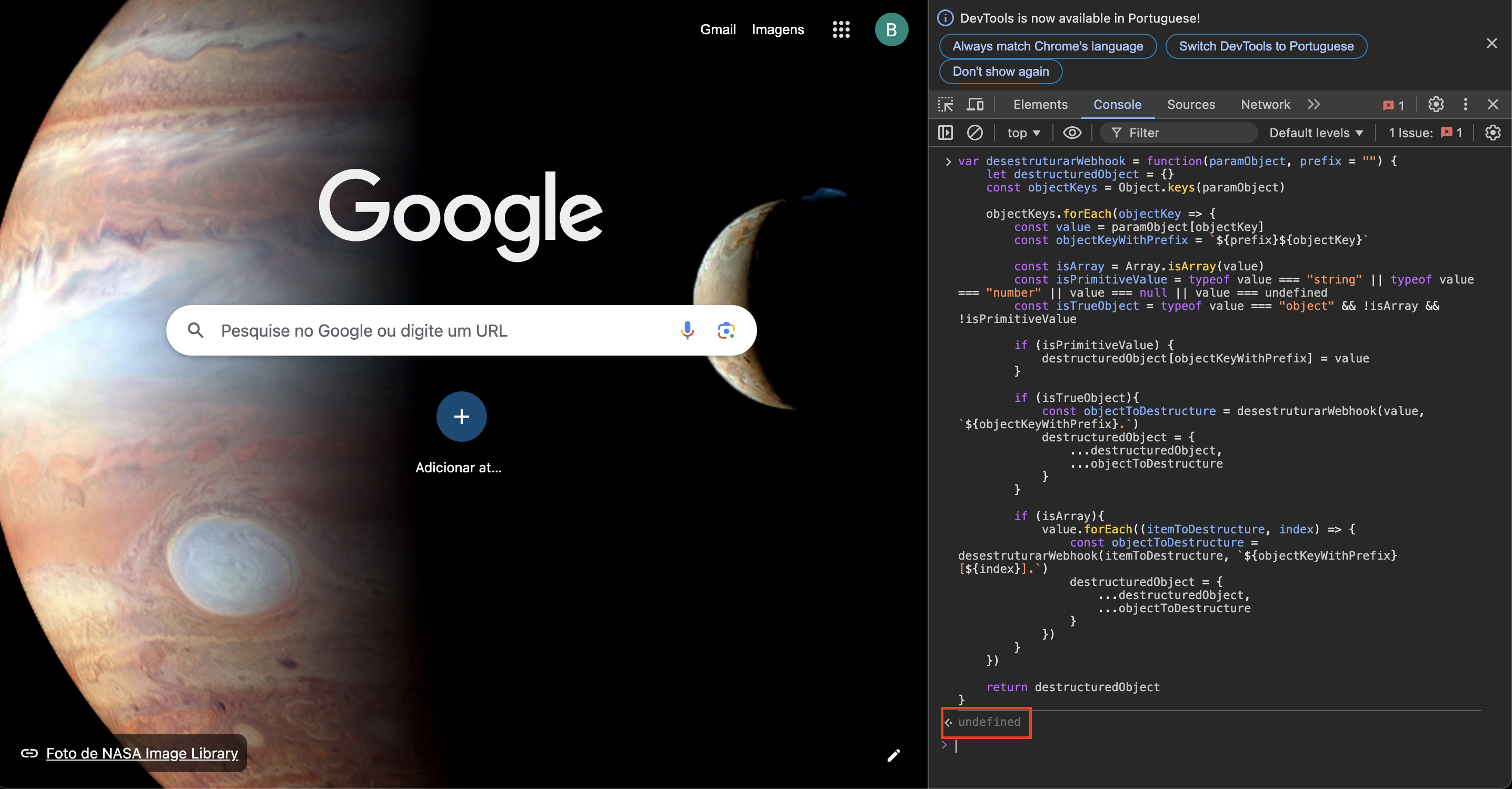 Depois de colar o código e pressionar enter, o resultado que deverá retornar na tela do console deverá ser undefined conforme o print abaixo: