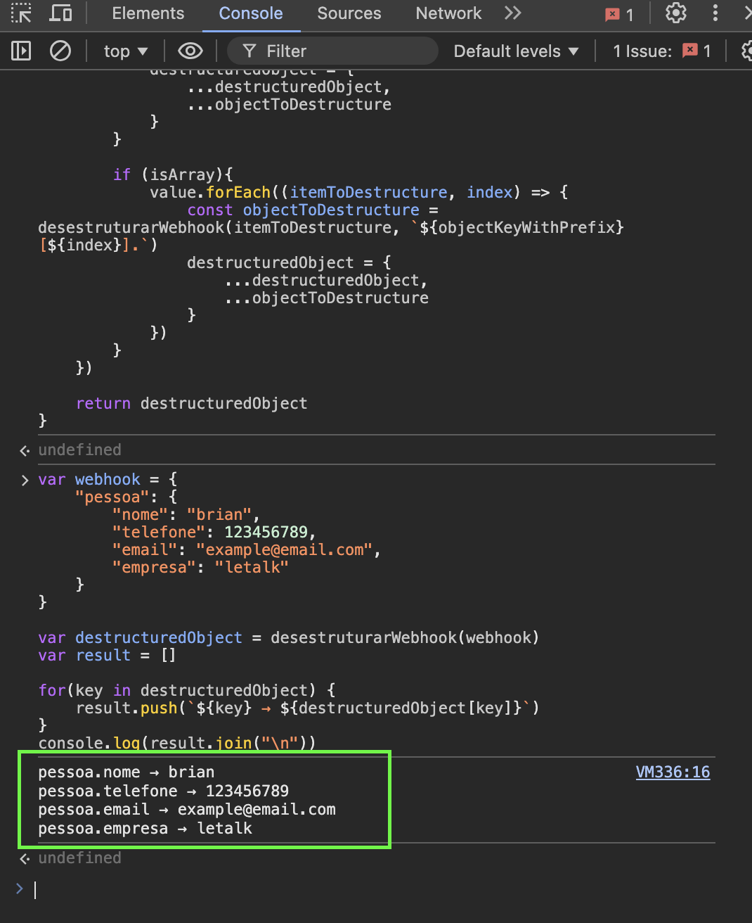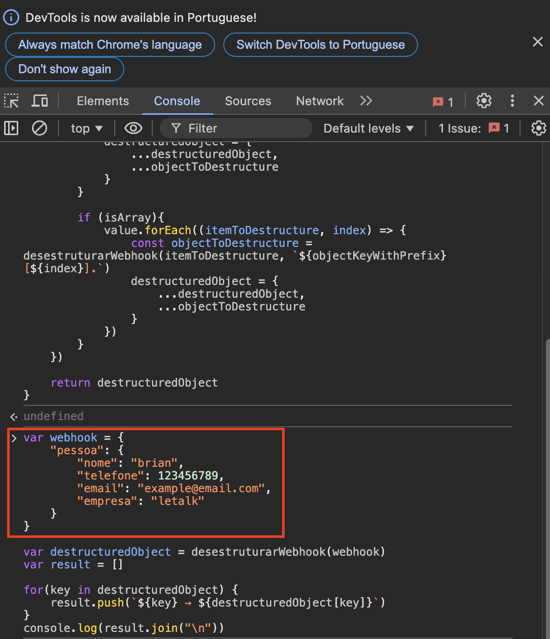 Depois de copiar o código e adicionar o conteúdo do JSON que foi recebido na Letalk, podemos pressionar enter e o resultado de saída no console será este destacado no retângulo verde: