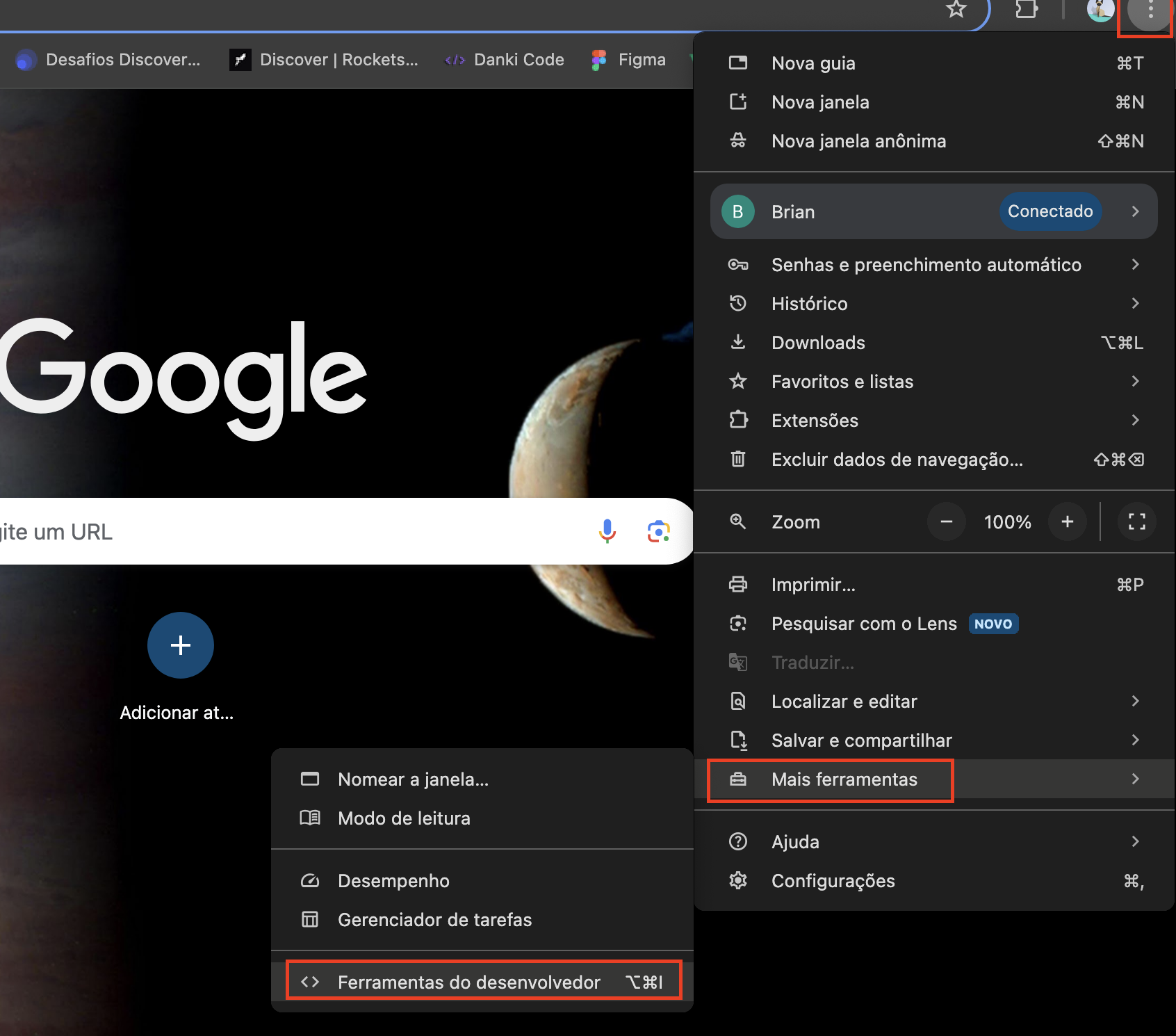 3. Clicando nos 3 pontinhos no canto superior direito da tela > Mais ferramentas > Ferramentas do desenvolvedor.